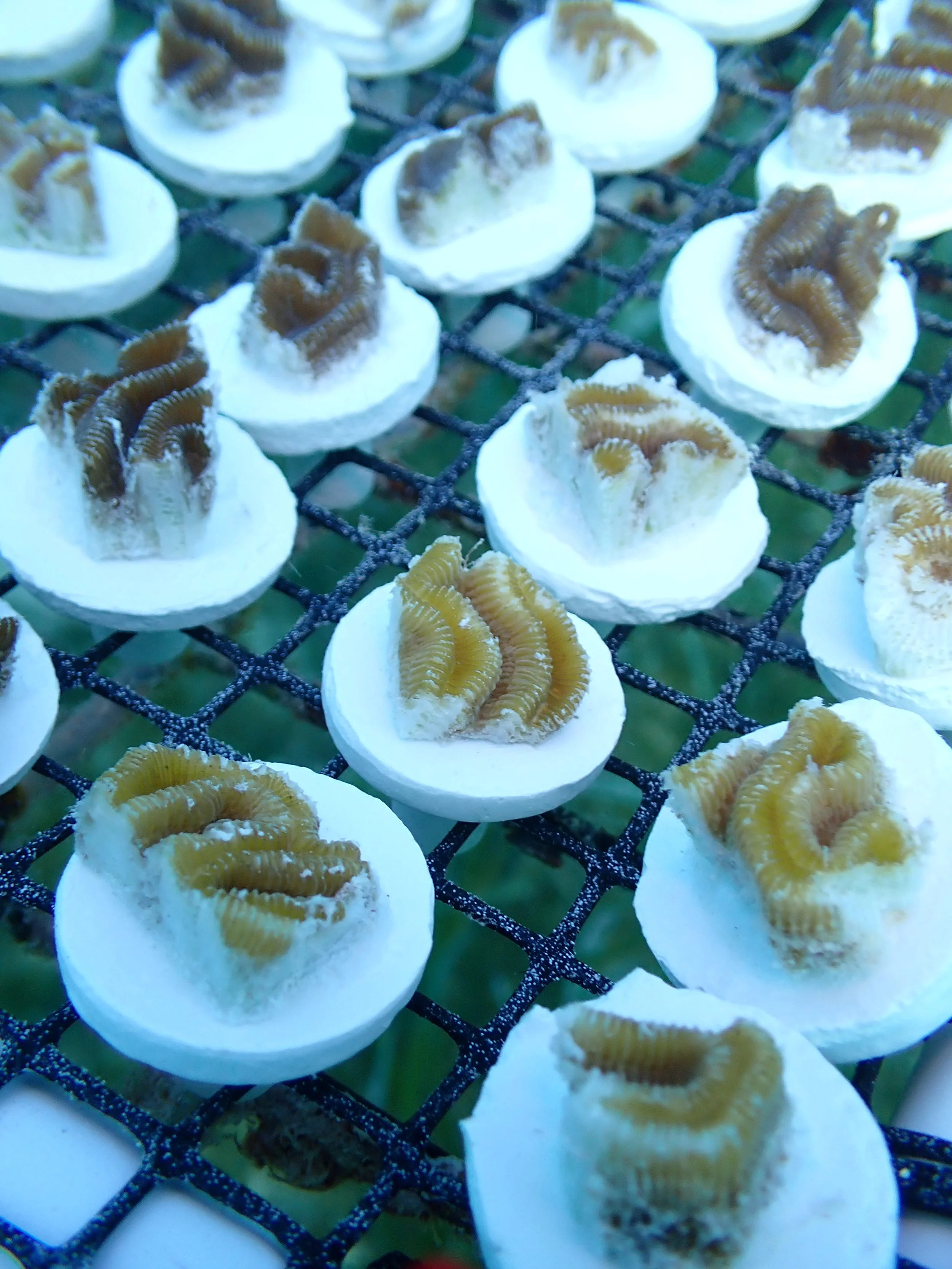 We utilise microfragmentation - or the splitting of coral colonies into small (dime-sized) fragments - to propagate and stimulate growth in boulder coral species such as brain and star corals. We have adapted this propagation technique from Dr. David Vaughan of the Plant a Million Corals Foundation and are rearing micro fragments in-situ with guidance from Ken Nedimyer of Reef Renewal.